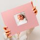 A janela do modelo Cameo é mais do que um detalhe, é uma declaração. A fotografia de 11 x 11 cm é impressa e cuidadosamente embutida na capa, fazendo parte da sua estrutura. Não é um encaixe para troca, mas sim a peça central e permanente do design do álbum. O tamanho da janela é o mesmo em todos os formatos, garantindo sempre o protagonismo da imagem.
