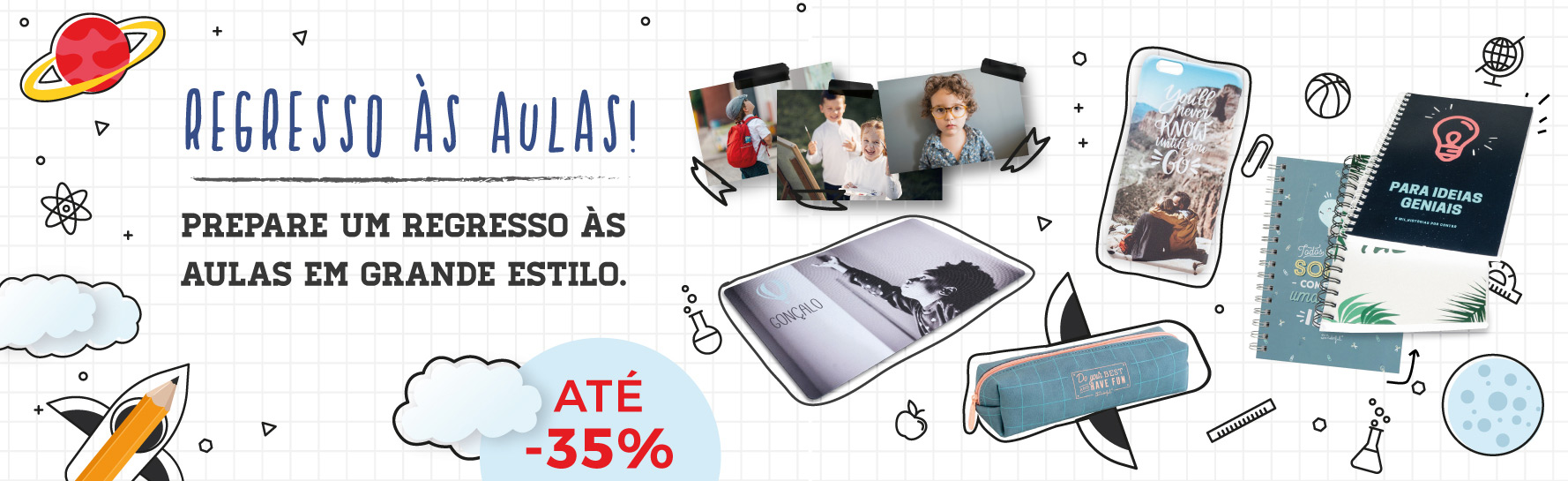 Os produtos incluídos no Regresso às Aulas da Fotosport são as categorias de presentes personalizados Canecas, Para o Escritório e Porta-chaves; Toda a categoria de Revelação de Fotos, Calendários e Foto Livros; Todas as Molduras de Mesa e ainda, cadernos e estojos Mr. Wonderful.