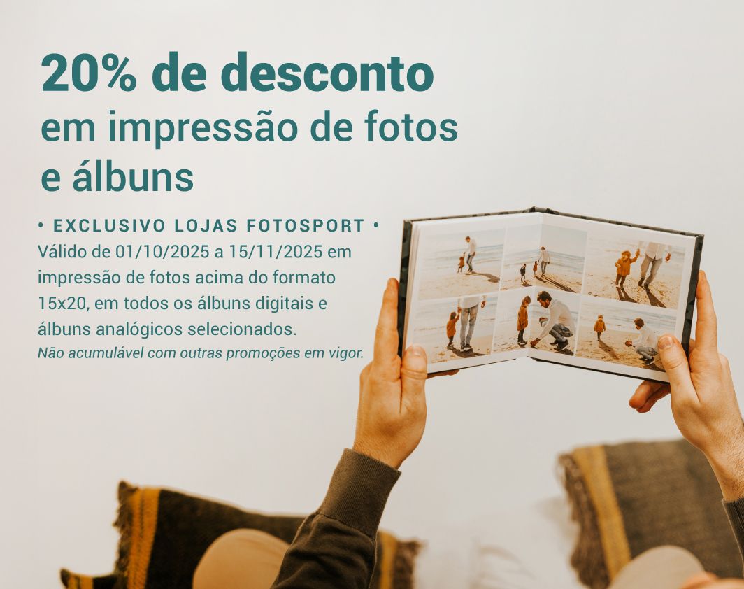 Promoção exclusiva lojas Fotosport aderentes, válida de 01/10/2025 a 31/10/2025 em impressão de fotos acima do formato 15x20, em todos os álbuns digitais e álbuns analógicos selecionados. Exclui packs de fotos. Não acumulável com outras promoções em vigor. Salvo rutura de stock.